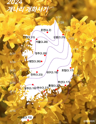 개나리 개화시기는 각 지역별로 3월 17경을 시작으로 4월 초까지 분포 되어 있습니다.