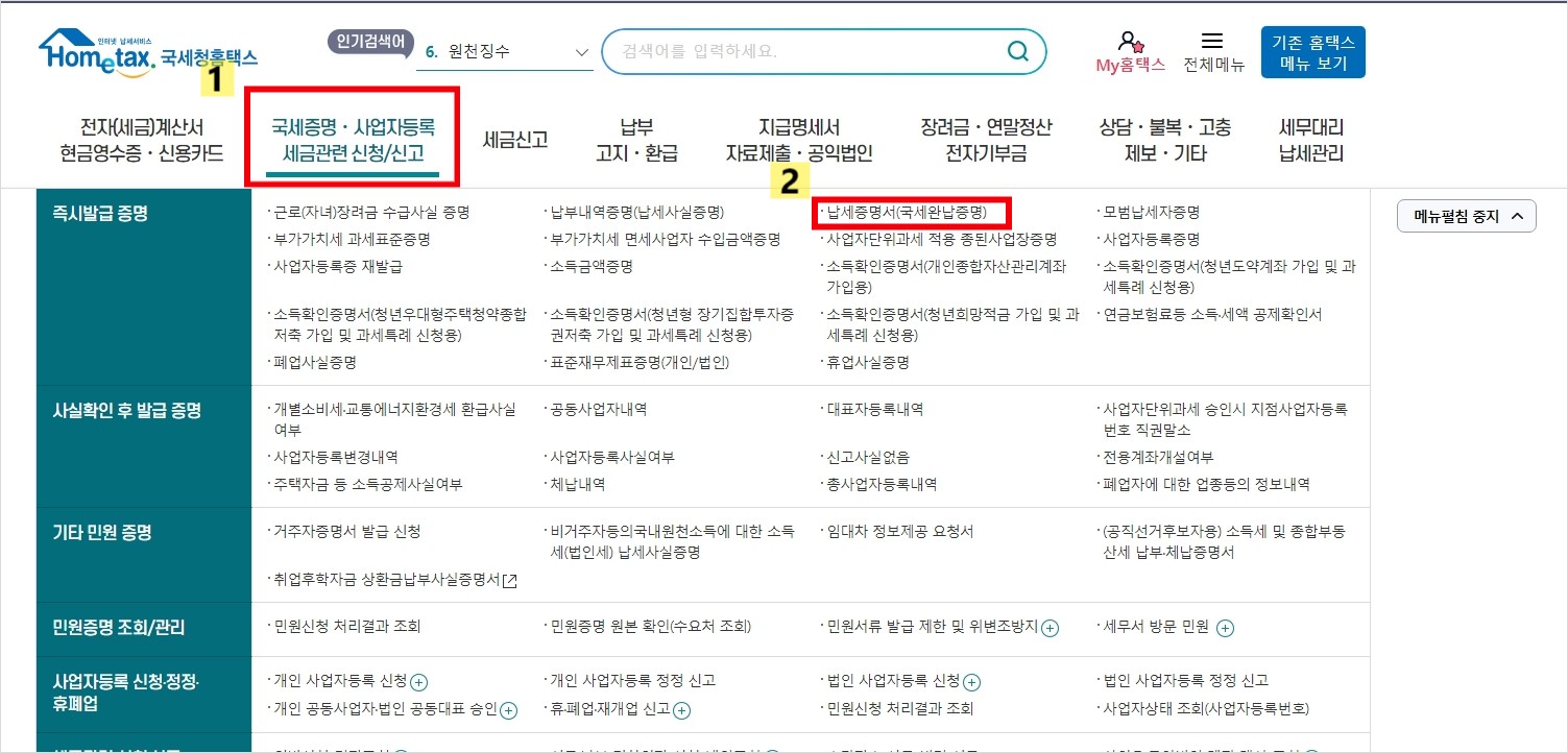 밑의 사진과 같이 국제증명,사업자등록 세금관련 신청/신고 에서 납세증명서(국세완납증명)을 클릭하세요.