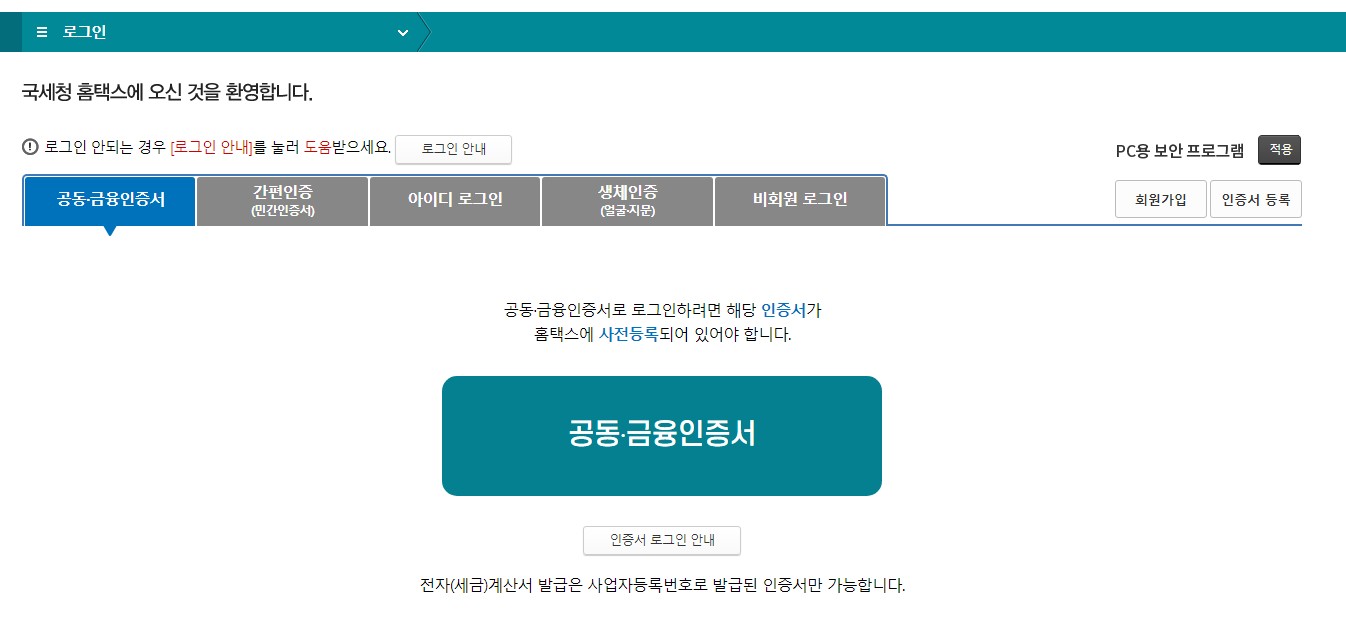로그인 화면으로 이동합니다. 로그인 방법은 공동,금융인증서 ,간편인증, 아이디로그인, 생체인증,비회원로그인 이 있습니다. 공동인증서를 미리 등록하셨다면 편리하게 로그인이 가능하며, 그렇지 않으시면 간편인증으로 로그인 하시면 됩니다.