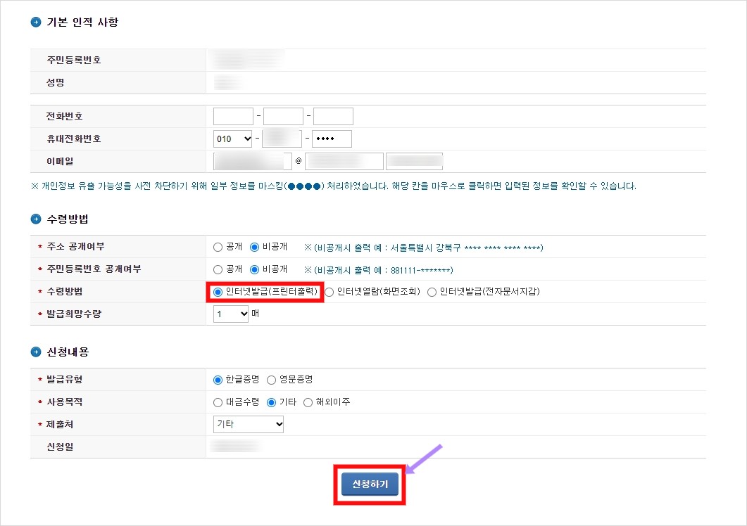 로그인을 하시면 기본 인적사항과, 수령방법, 신청내용 작성란이 나옵니다. 기본 인적 사항 적어주시고 수령방법은 저는 인터넷발급으로 선택해주셔서 pdf파일로 받기 위해 인터넷발급을 선택했습니다. 신청내용에서 발급유형 선택하셔서 신청하기를 클릭해주시면 됩니다.