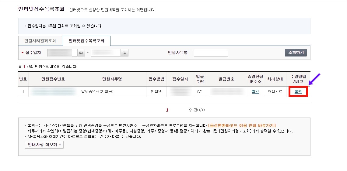 신청하기가 완료 되면 인터넷 접수 목록조회 화면으로 넘어갑니다. 밑의 사진같이 수령방법/비고란에 출력을 클릭해주세요.