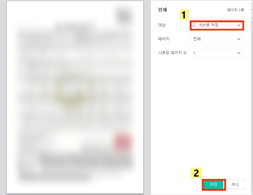 인쇄 페이지 화면이 나오면 pdf로 저장으로 하시고 저장을 누르시면 컴퓨터에 pdf파일로 들어오게 됩니다. 집에 프린터기가 있으면 프린터도 가능합니다.
