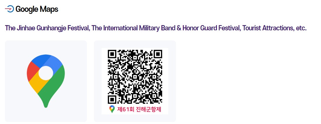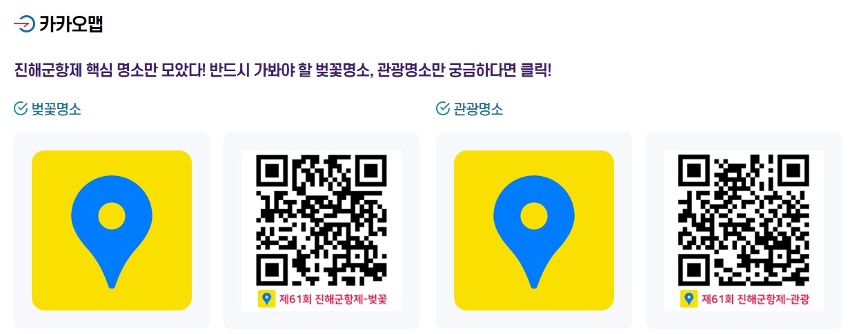 창원시청 홈페이지에 지도로 보는 군항제라고 하여 주요 명소위치와 길찾기를 한번에 할수 있는 QR코드를 공유 해주었습니다. 필요하실때 사용해보시면 굉장히 유용할것 같습니다.