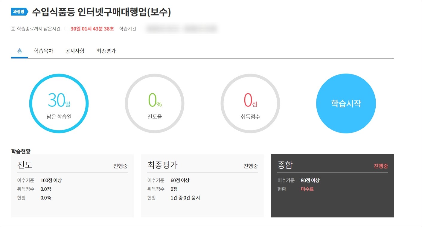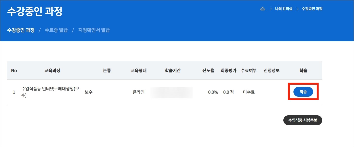 내 수강중인 과정이 나옵니다. 학습하기를 클릭하시면 수입식품 보수교육을 수강하실수 있습니다.