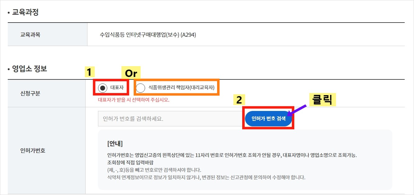 대리인이 받으시면 식품위생관리 책임자(대리교육자) 에 체크를 하시고