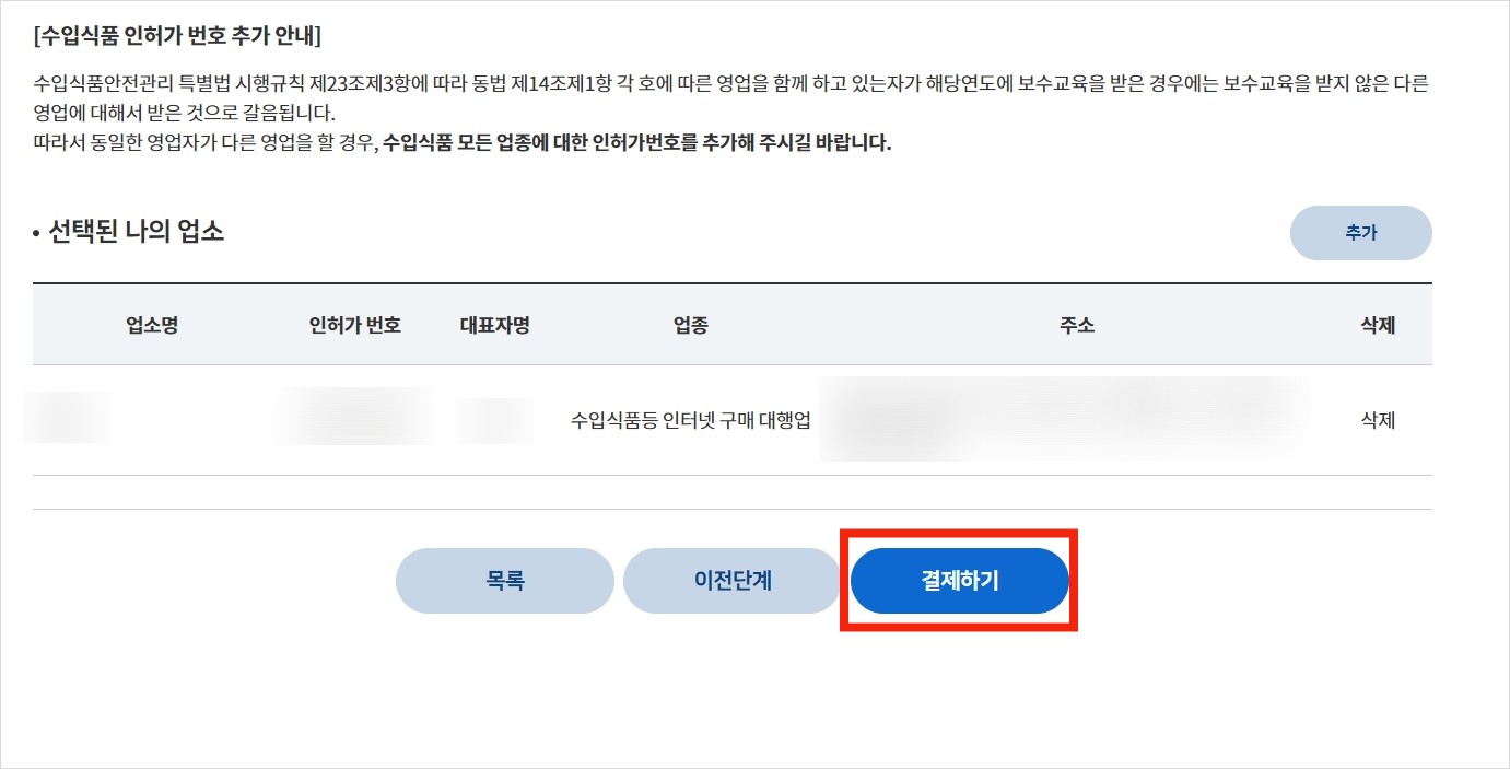 ▼ 화면 하단에 선택된 나의 업소가 나오고 그 밑에 결제하기가 나옵니다. 결제하기를 클릭하셔서 결제를 진행해 주세요.