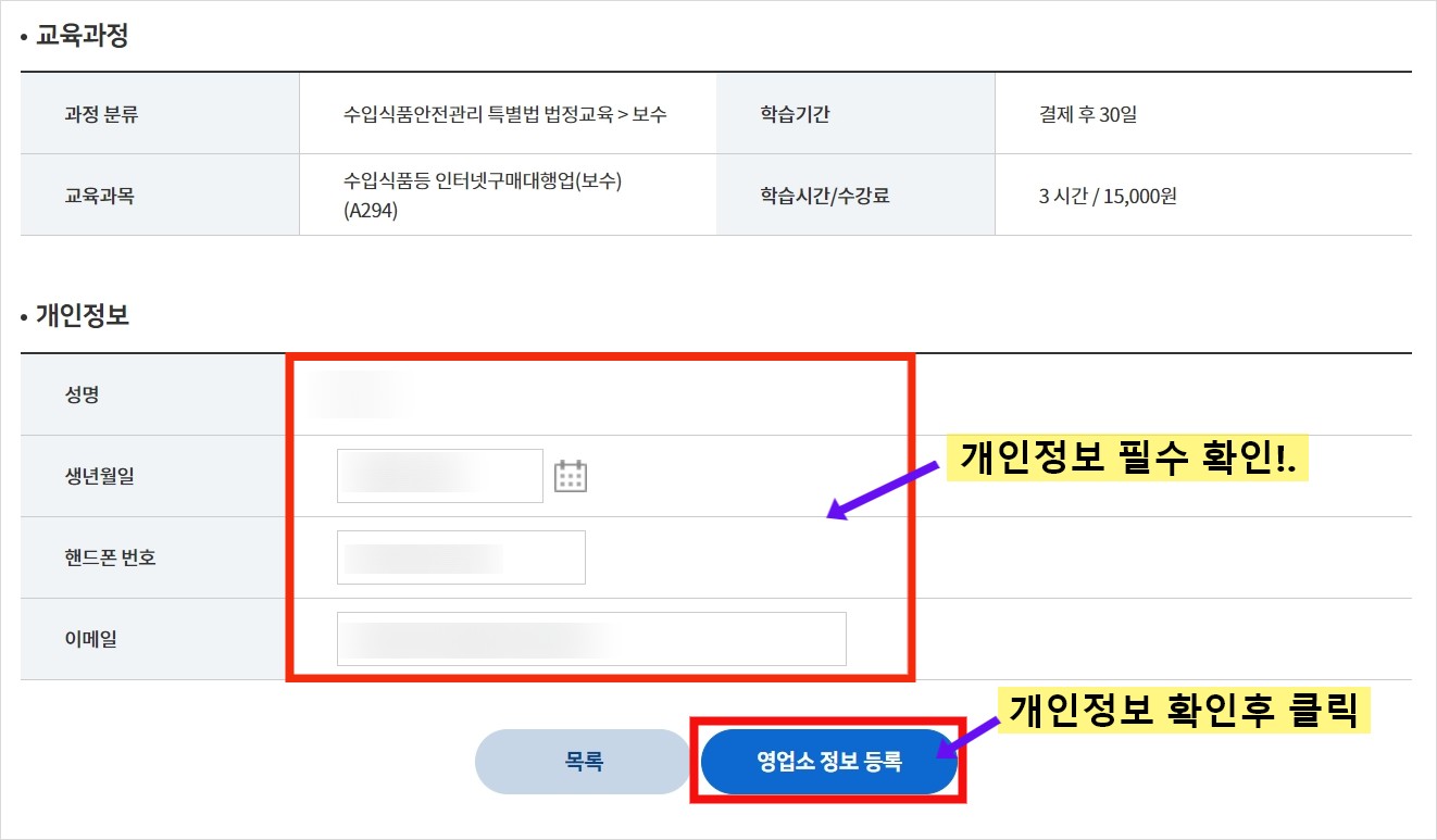 ▼ 본인인증을 하시면 받아야될 교육과정 정보와 개인정보 확인란이 나옵니다.
