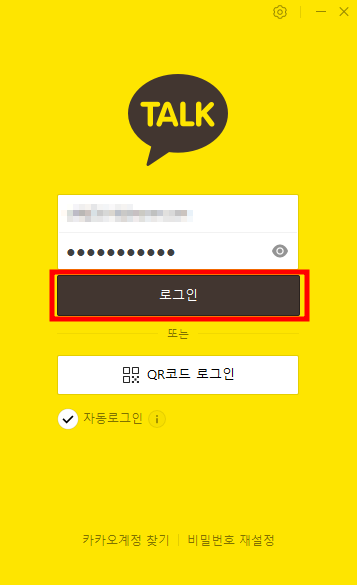 설치가 완료되면 아래 사진처럼 카카오톡 로그인창이 실행됩니다.
