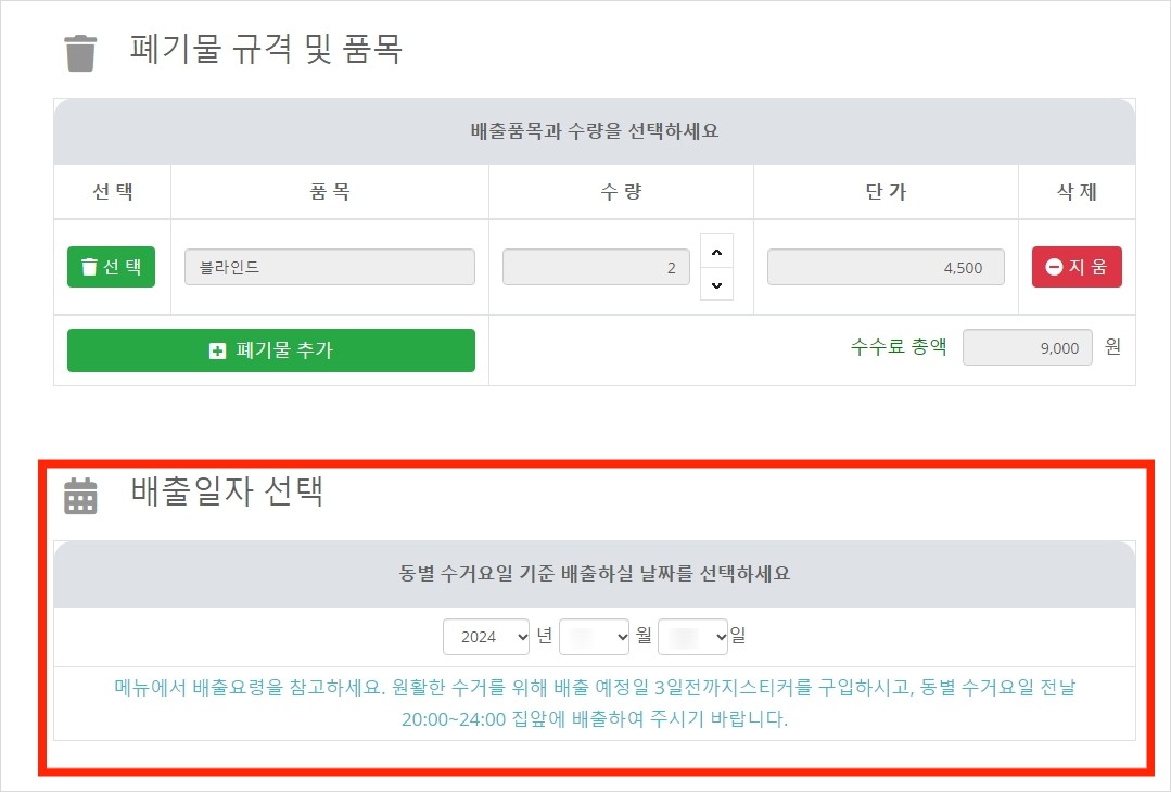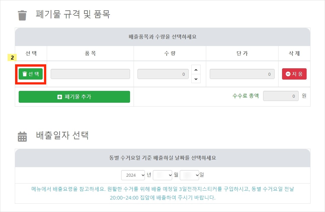 폐기할 물품 찾은후 선택후 배출일자 선택