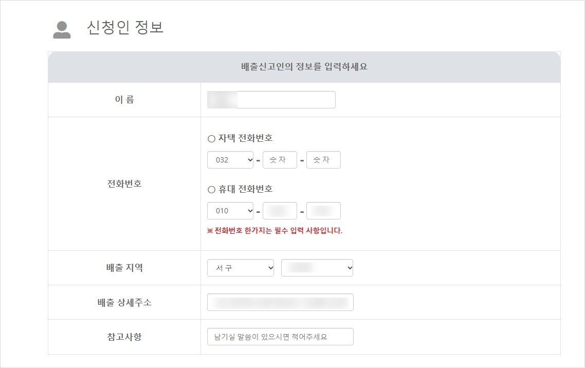신청인 정보에 성함, 전화번호 ,지역, 상세주소 적기