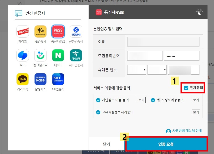 민간인증서중 하나를 고르셔서 오른쪽 본인 인증 정보를 입력 하시고 전체 동의후 인증요청을 해주세요. 저는 pass로 인증 해보겠습니다.