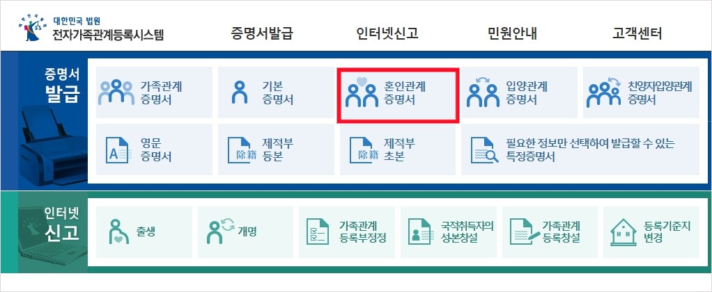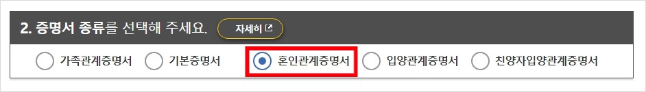 해당 사이트 검색하셔서 접속 하셨다면 증명서 발급란에 나오는 혼인관계 증명서란을 클릭하세요.