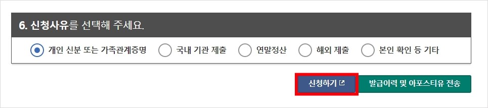 발급받으시고자 하는 사유에 체크 하시고 <신청하기>를 누르시면 됩니다.