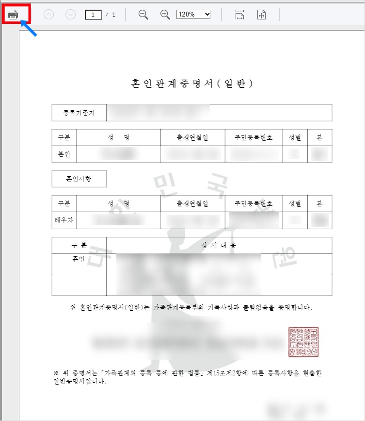신청하기를 누르시면 혼인관계증명서가 발급 됩니다. 화살표에 있는 프린트 그림을 클릭하시면 PDF로 저장 하시거나 직접 프린트가 가능합니다.