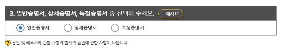 혼인관계 증명서에는 일반증명서, 상세증명서, 특정증명서 3가지가 있습니다. 증명서성격에 맞게 고르셔서 체크해주세요