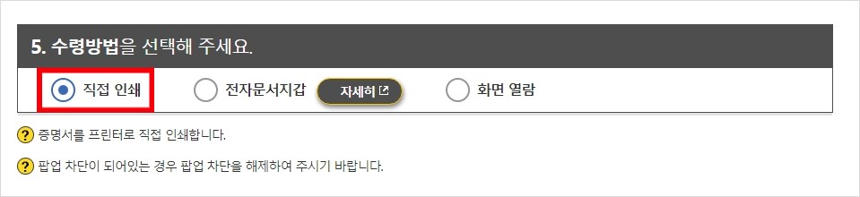 수령방법에는 직접인쇄, 전자문서지갑, 화면열람 세가지가 있는데 저는 직접인쇄를 선택해서 PDF로 저장해보겠습니다. 집에 프린터가 있다면 인쇄도 가능합니다.
