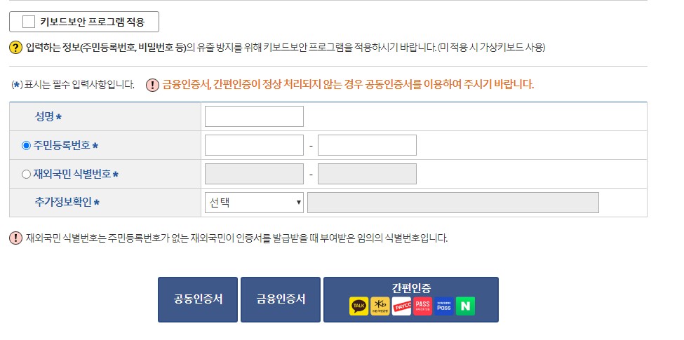 위 이용약관에 동의 합니다에 체크 하시고 밑으로 내려보면 본인인증 하는 것이 있습니다. 성명과 주민등록번호 or 재외국민 식별번호 ,추가정보 확인에서 하나를 골라서 입력 하시고 공동인증서, 금융인증서, 간편인증중 하나를 선택 하여 인증을 하세요. 저는 간편인증으로 인증을 하겠습니다.